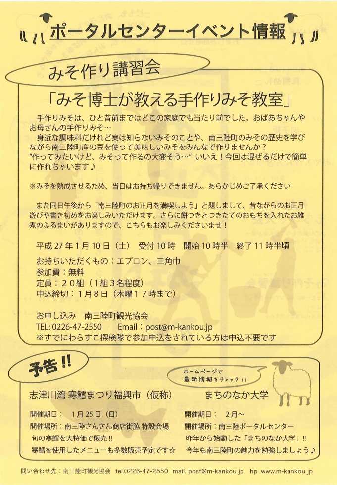 件名に『1/10 みそ作り 参加申込』と記載願います