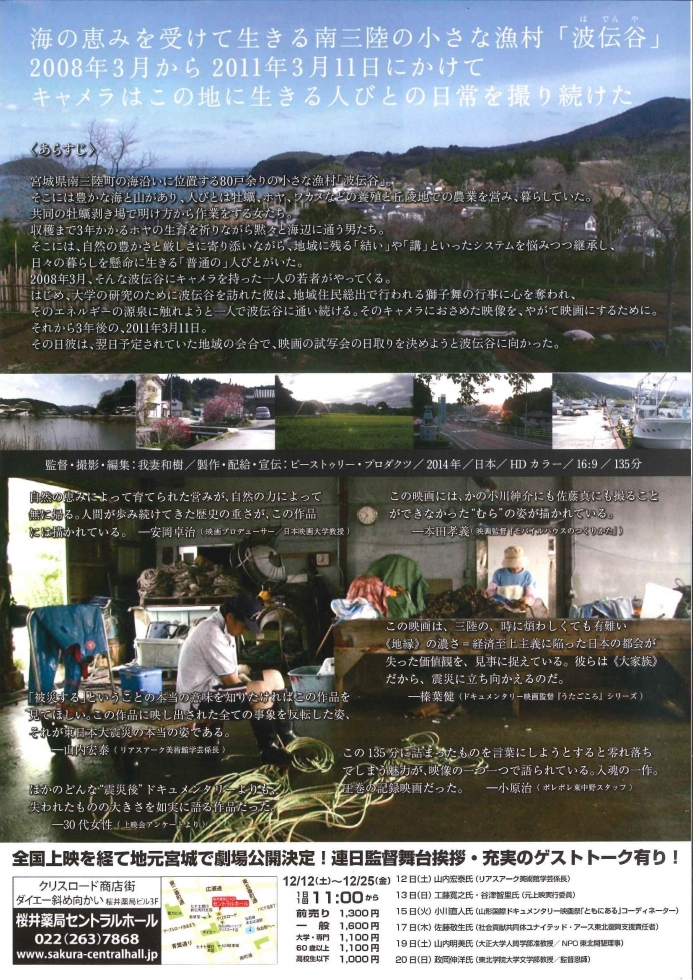 南三陸町の波伝谷を震災前の2008年3月から2011年3月11日にかけて撮影されたドキュメンタリー映画です。世界で唯一震災前の営みを伝える映画が仙台市の櫻井薬局セントラルホールにて上映されます。上映期間は12月12日~12月25日までとなっています。この機会にぜひご鑑賞ください。