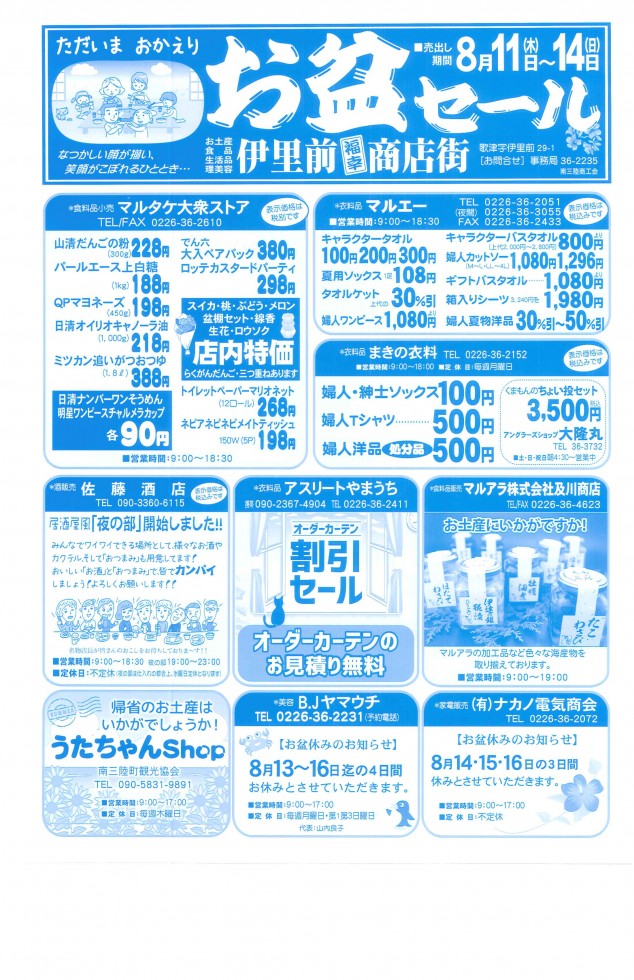 8月11日(木祝)~14日(日)まで「伊里前福幸商店街お盆セール」を開催しております