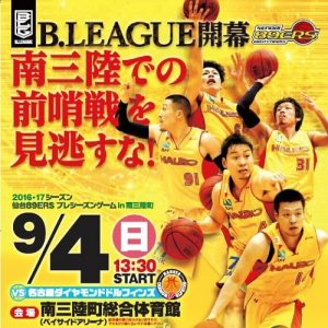 9月4日(日)「2016-17シーズン 仙台89ERS プレシーズンゲーム in南三陸町」を開催します。