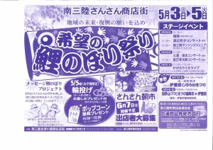 南三陸町の子供たちの手型とメッセージで着飾った鯉のぼりが、空一面にたなびきます。