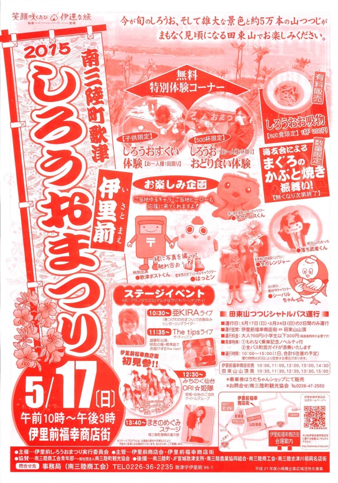 伊里前福幸商店街では、5月17日(日)には伊里前しろうおまつりが開催され、しろうおの踊り食い(無料)やしろうおすくいがお楽しみ頂けます。