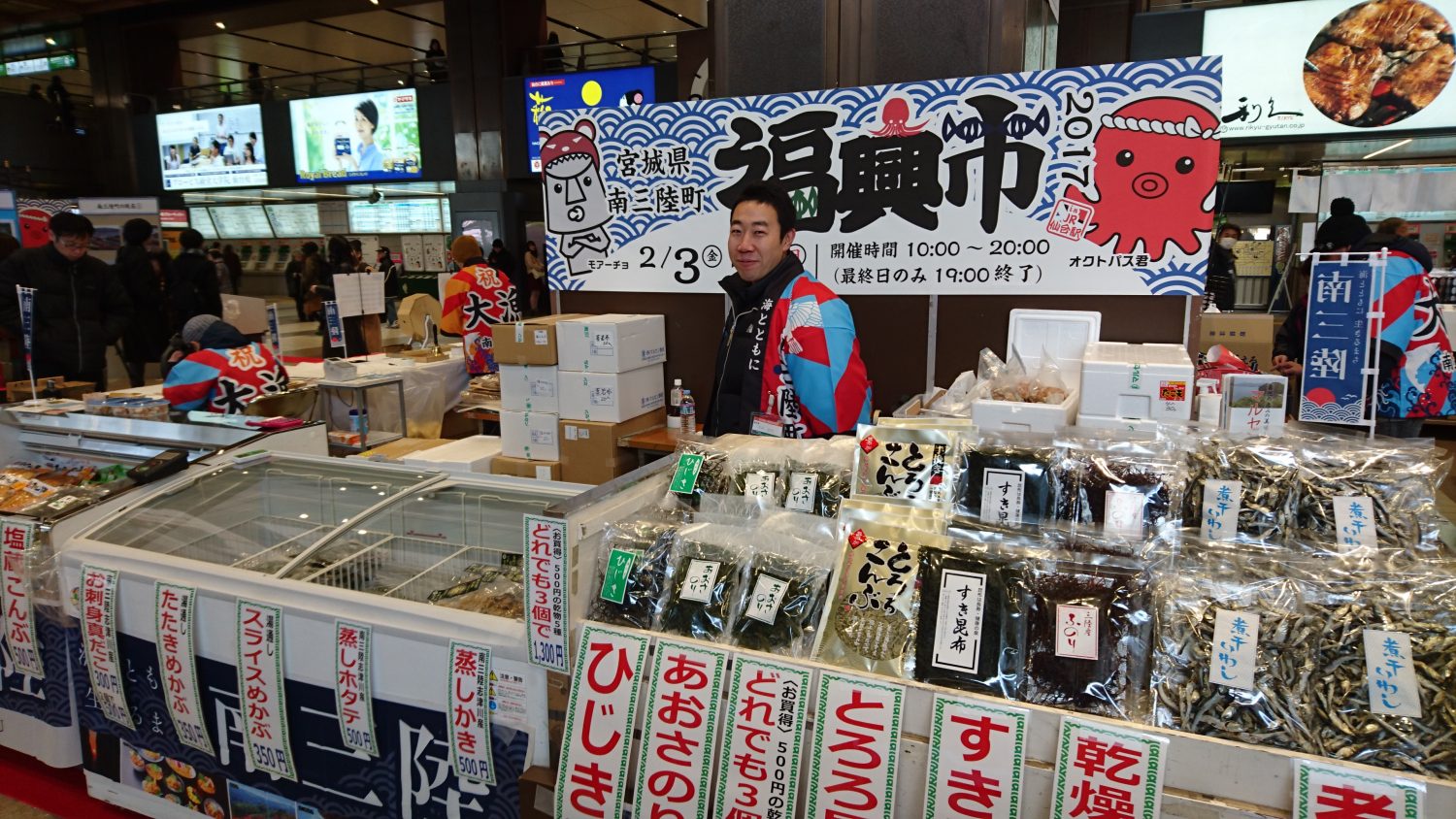 南三陸町から9店舗が集結し、自慢の水産加工品・スイーツ・オリジナルグッズ雑貨など約200品目をご販売しながら、南三陸町の元気と魅力を発信いたします!
