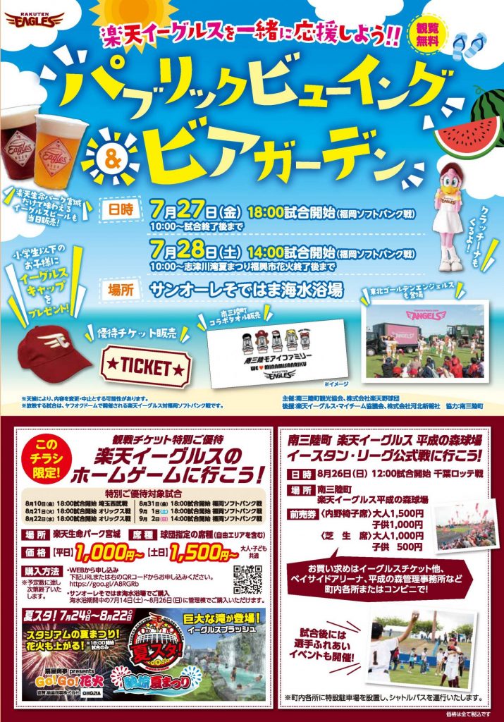 南三陸で楽天イーグルスの試合を応援するパブリックビューイングの開催や海で楽しむビアガーデンなどが予定されており、他にも今回限定のコラボグッズ販売など内容盛り沢山の企画となっております。