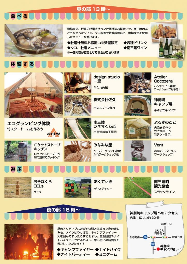 昼はアクティブに各種遊びや体験、夜はまったり火を囲んだり星空を見たり、それぞれの時間帯毎に楽しみのあるイベントです。