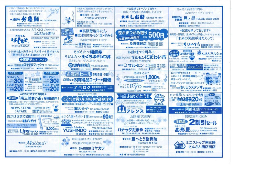 商店街内28の店舗さんからもお祝いの言葉や大感謝セールの店舗告知も掲載されています。