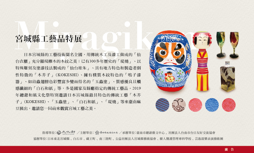 主催側は台南市民と日本との交流、理解の促進、ならびに日本文化、観光及び特産品などの宣伝・販売、さらに台湾国内での日本の「日本国及び県指定伝統工芸」に対する認知度の向上を目的に、「2019総爺和風文化祭」を開催するという!