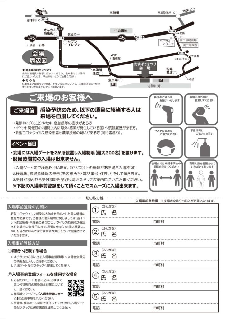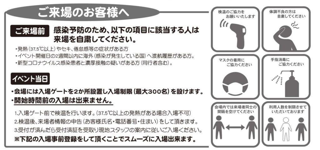 - 入口では検温を実施し、感染者が出た場合等に備え、入場者の個人情報の登録(氏名、連絡先、居住地)を行います。※当日の混雑を避けるため事前登録制を導入致します。