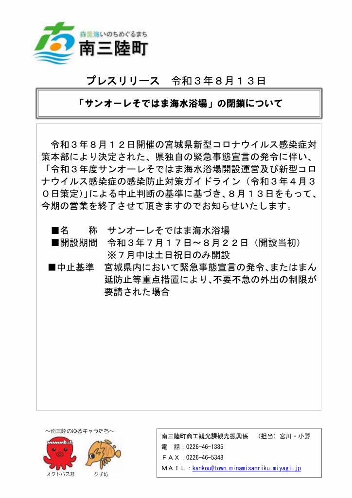 令和3年8月12日開催の宮城県新型コロナウイルス感染症対策本部により決定された、県独自の緊急事態宣言の発令に伴い、「令和3年度サンオーレそではま海水浴場開設運営及び新型コロナウイルス感染症の感染防止対策ガイドライン(令和3年4月30日策定)」による中止判断の基準に基づき、8月13日をもって、今期の営業を終了させて頂きますのでお知らせいたします。