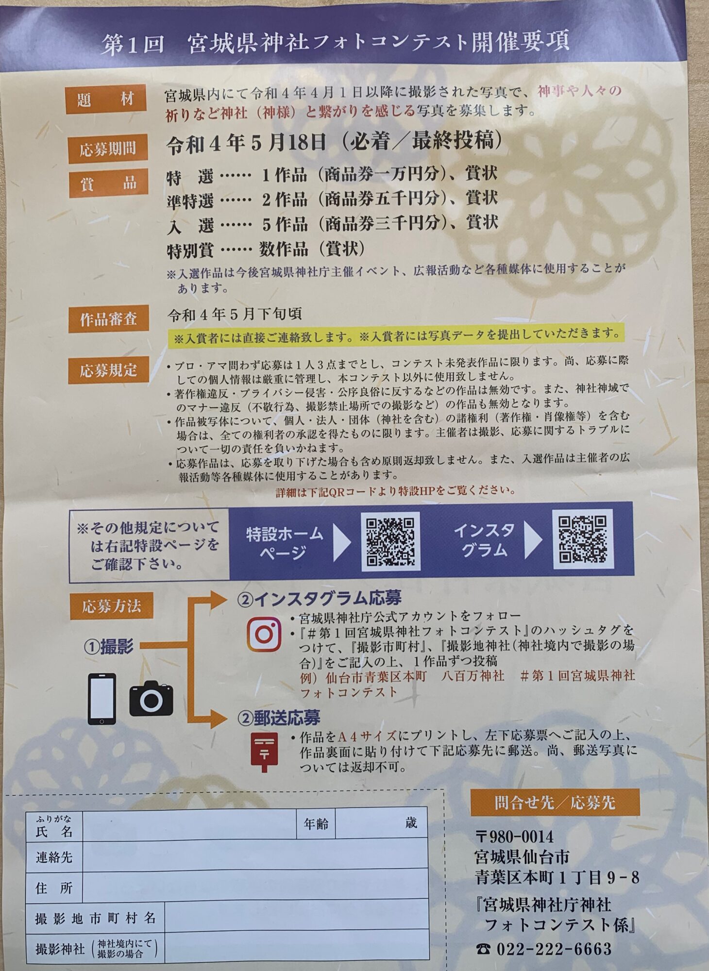 宮城県神社庁主催で、第1回宮城県神社フォトコンテストを行っています。