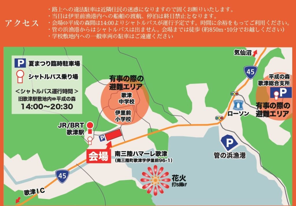 駐車場:管の浜漁港、平成の森歌津総合支所