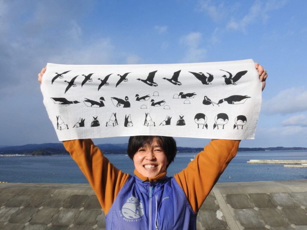 世界に3亜種いるうちの1種は、日本で2,500羽〜3,000羽越冬します。そのうちの400羽ほどが志津川湾で越冬します。志津川湾で過ごすいろいろな姿のバリエーションを白黒のシンプルな手ぬぐいにしました!1羽だけちがう鳥が描かれているのは、オオバンです。なぜオオバンが・・・?」