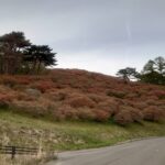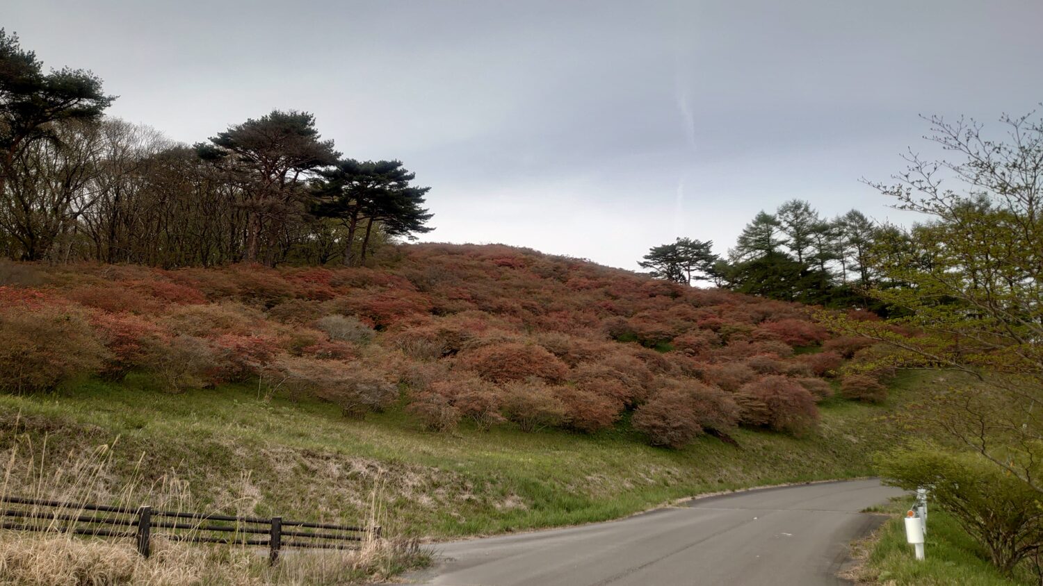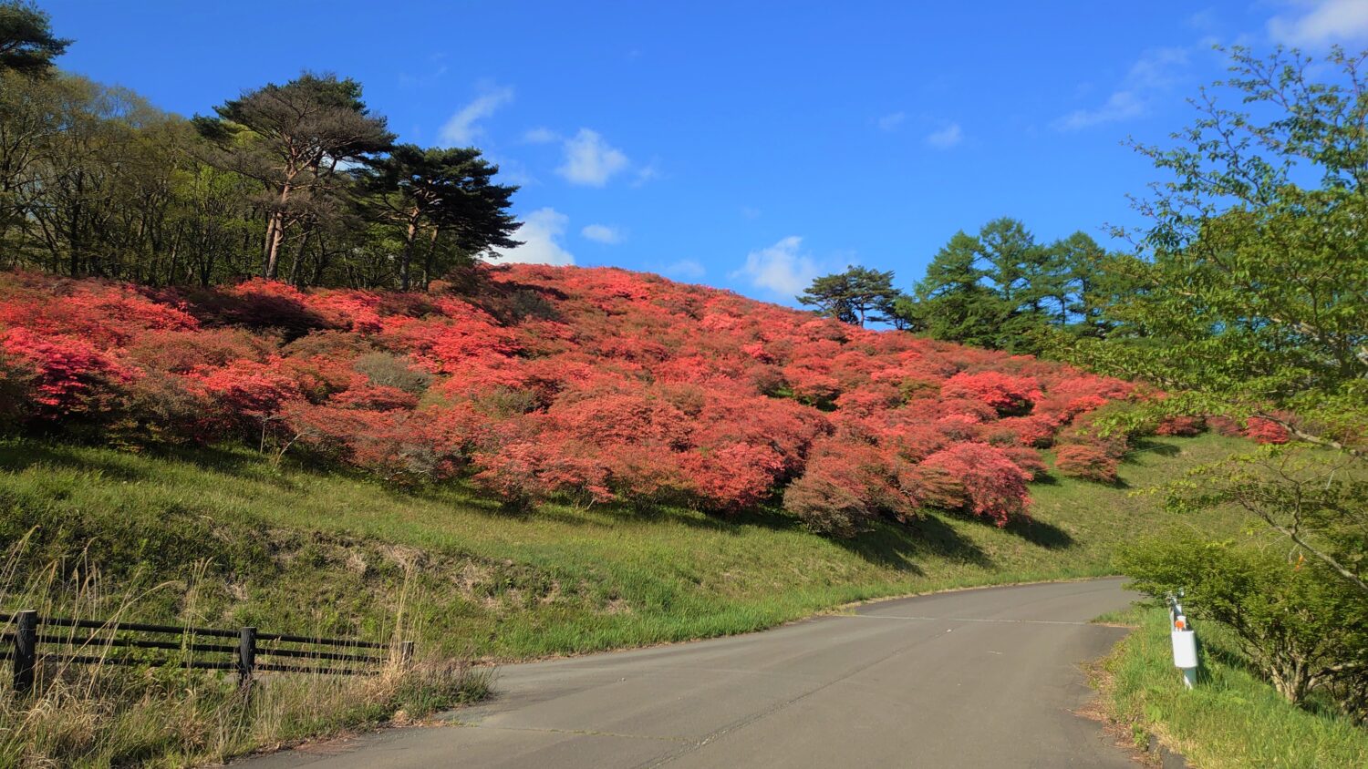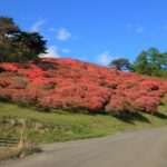 - 山肌のつつじは平地からもハッキリ見えるほど赤く色づきました
