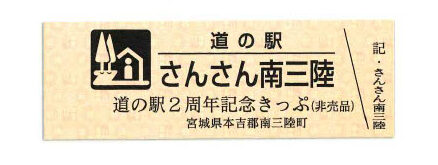 道の駅2周年記念特別デザイン非売品「道の駅記念きっぷ」を道の駅内1,000円お買い上げ毎に1枚(1人2枚まで)、限定300枚配布します!レシート(複数枚可)を持って、南三陸ポータルセンターまでお越しください。
