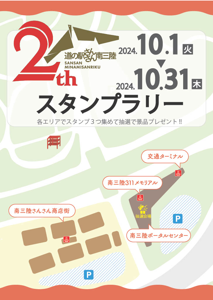 南三陸さんさん商店街、南三陸311メモリアル、JR志津川駅の3か所に設置されているスタンプを全て集めて、抽選でノベルティをプレゼント!