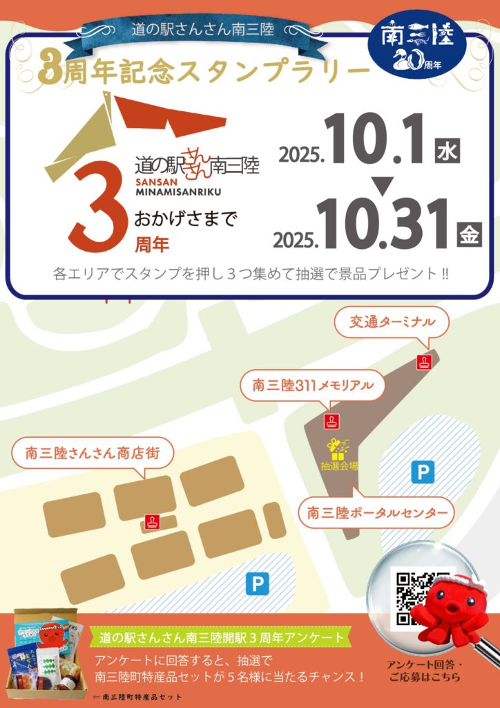 また、スタンプラリー台紙には「道の駅さんさん南三陸 開駅3周年アンケート」も掲載しています。アンケートに答えると、抽選で5名様に南三陸町特産品セットが当たります。ぜひアンケートにもご参加ください♪