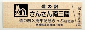 道の駅3周年記念特別デザイン非売品「道の駅記念きっぷ」を道の駅内1,000円お買い上げ毎に1枚(1人2枚まで)、限定300枚配布します!レシート(複数枚可)を持って、南三陸ポータルセンターまでお越しください。