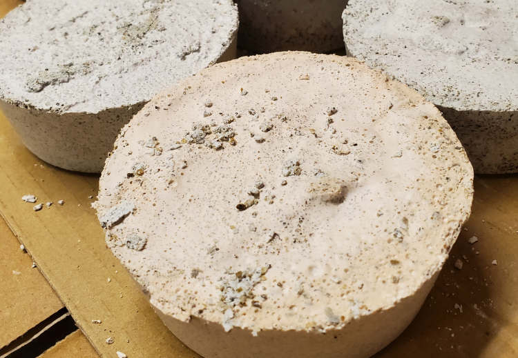 石膏で固められたブロックの中には、化石や鉱石がランダムに封入されており、