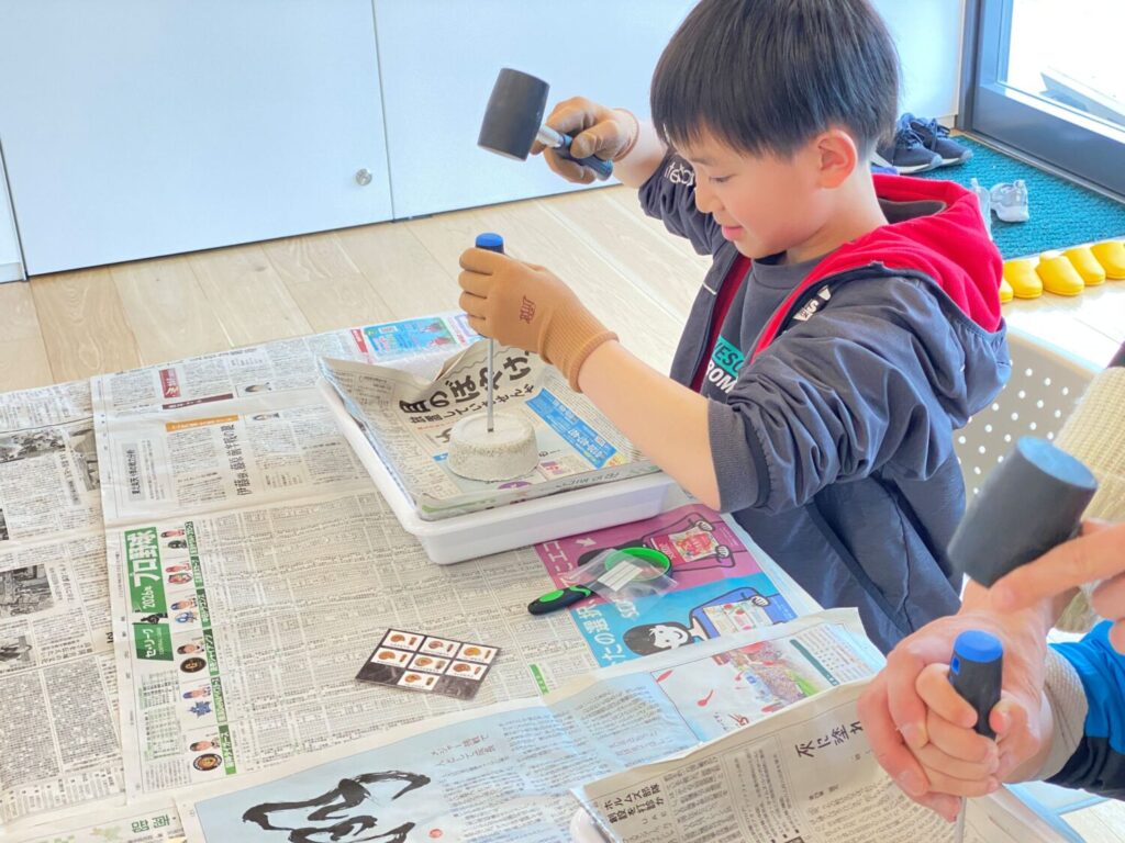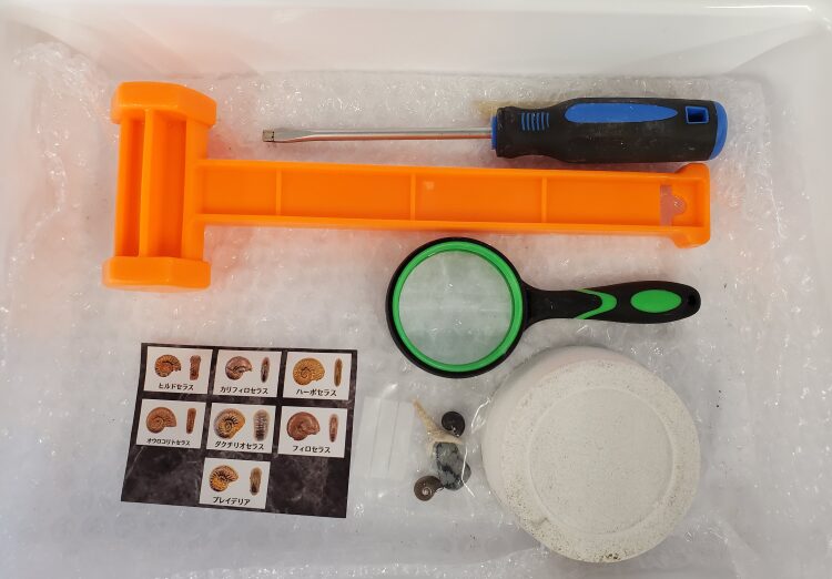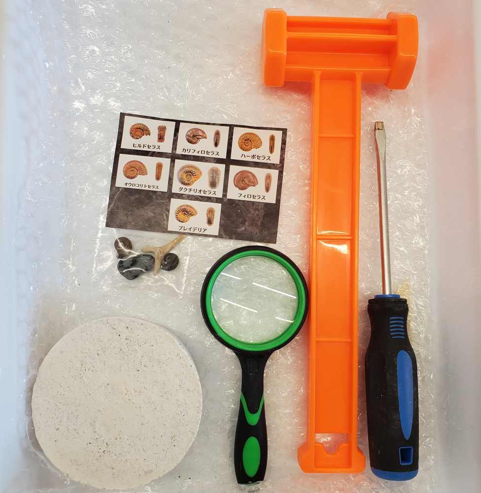 本物の化石が入ったブロックを削り、自分の手で掘り出す発掘体験キットです。
