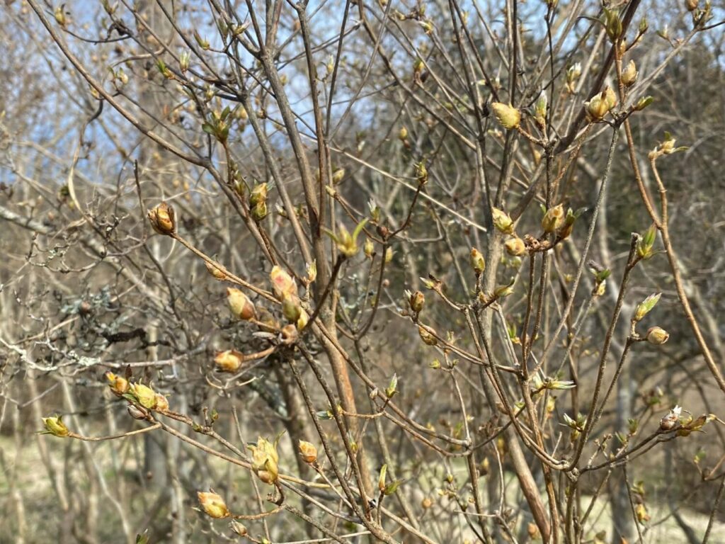 全体的には、まだ小さく硬いつぼみが少しずつ顔を出し始めた「芽吹き」の段階です。場所によっては、少しずつ膨らみ始めたつぼみも見受けられます。