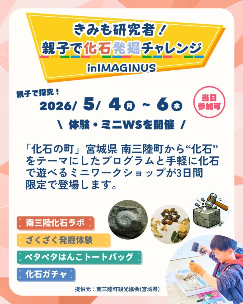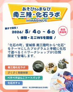 一般社団法人南三陸町観光協会は2026年5月4日(月)~6日(水)のGW期間、東京都杉並区の科学体験施設IMAGINUSにて、出張体験イベントを開催します。「世界最古級の”魚竜”化石」や「謎多き生物である”のうとう類”化石」など、知る人知る希少化石の宝庫である南三陸町。化石の町にちなんだ体験プログラム・ミニワークショップを提供予定です。