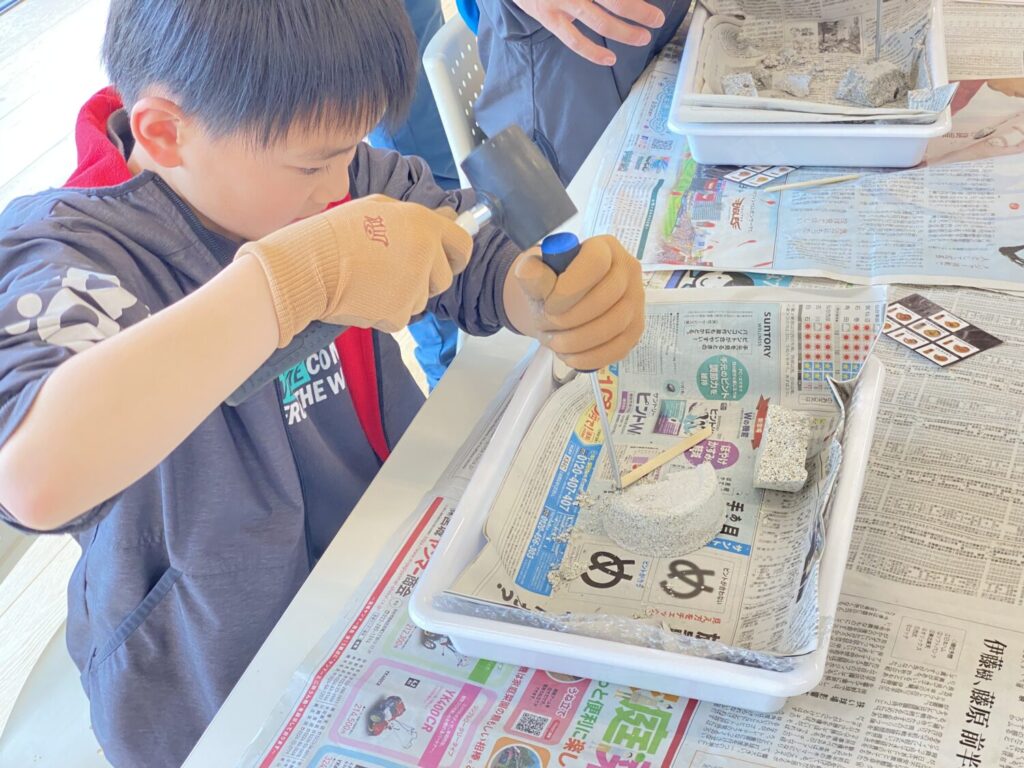 化石ブロックを好きなだけ削り、隠された化石や鉱石を掘り出す体験です。見つかった化石・鉱石は全てお持ち帰り可能!