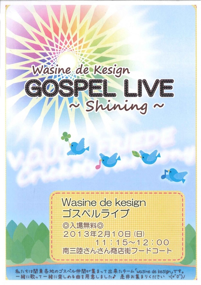 今月2月10日11:15より@南三陸さんさん商店街にて、”Wasine de kesign”よるゴスペルライブが開催されます。