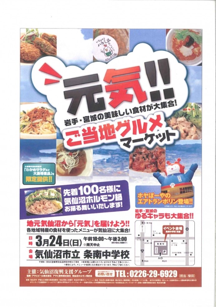 今月24日に、気仙沼市条南中学校にて「元気!!」ご当地グルメマーケットが開催されます。