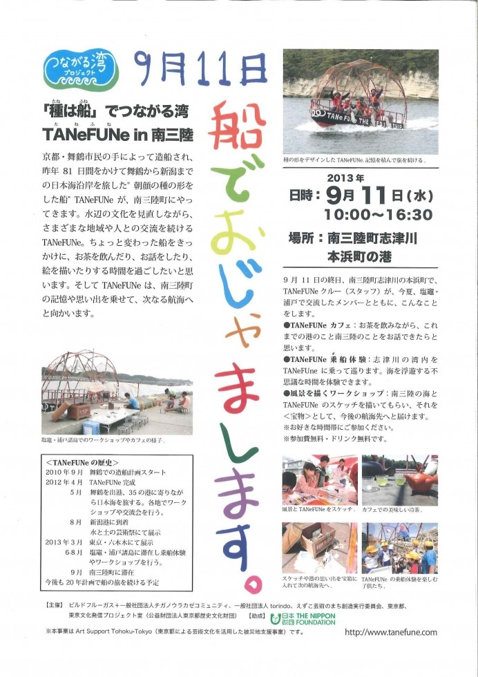 京都・舞鶴市民の手によって造船され、昨年81日間をかけて舞鶴から新潟までの日本海沿岸を旅した“朝顔の種の形をした船TANeFUNeが南三陸町へやってきます!