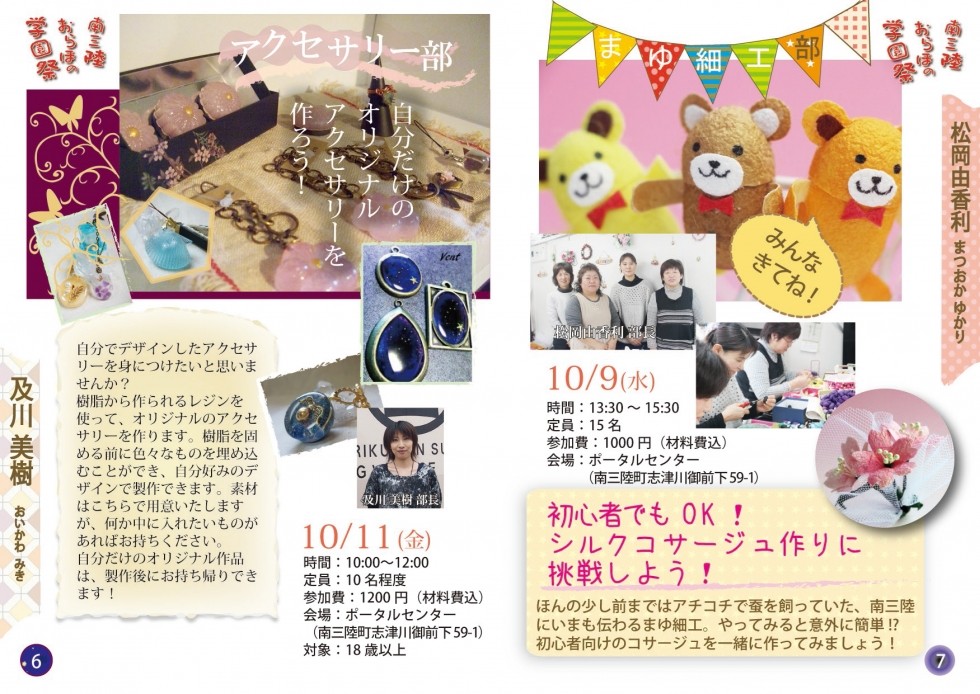 カギ編み髪ゴム作り(500円)・シュシュ作り(500円)・天然石ブレスレット作り(1000円)