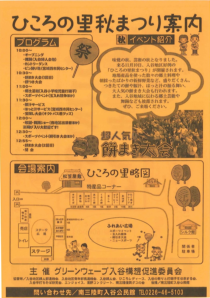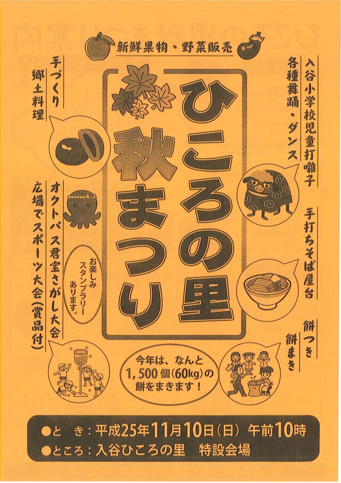 来る11月10日、入谷地区好例の「ひころの里秋まつり」が開催されます。