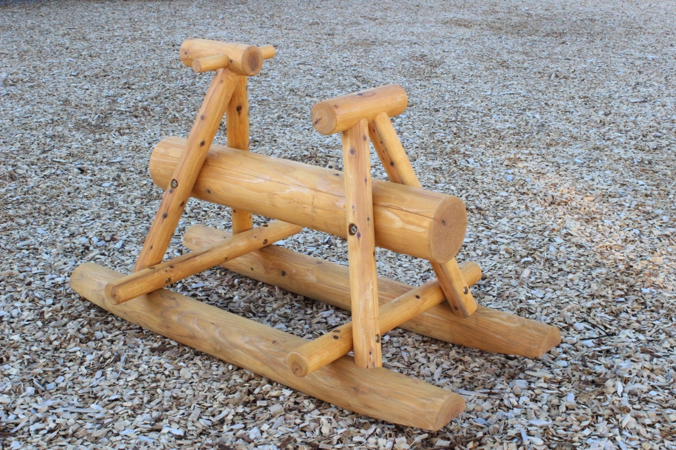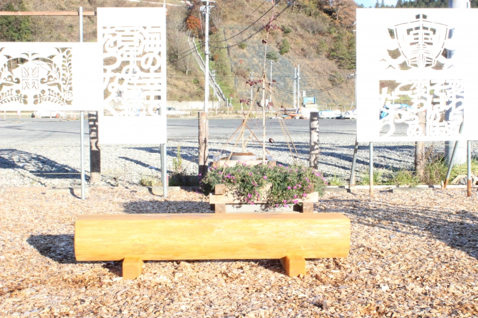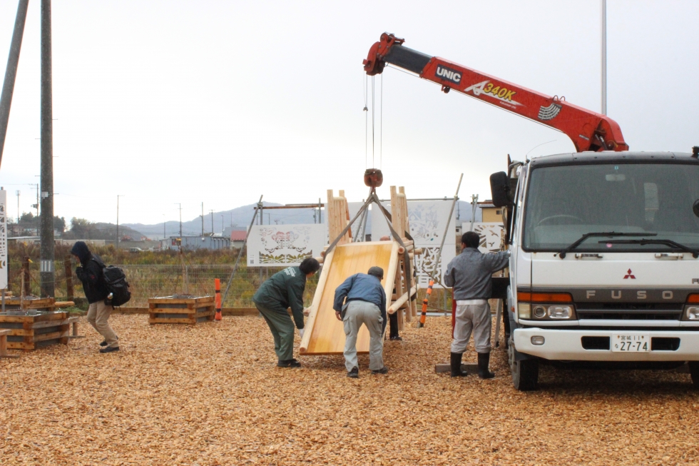 本日、南三陸ポータルセンター前のウッドチップが敷き詰めてあるスペースに木製の遊具が設置されました!