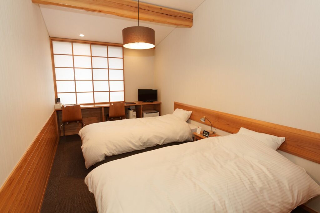 いりやどアネックスは、南三陸産の杉をふんだんに使用したお宿です。部屋に入ると木の温かみやぬくもりを感じて寛いでいただくことができます。