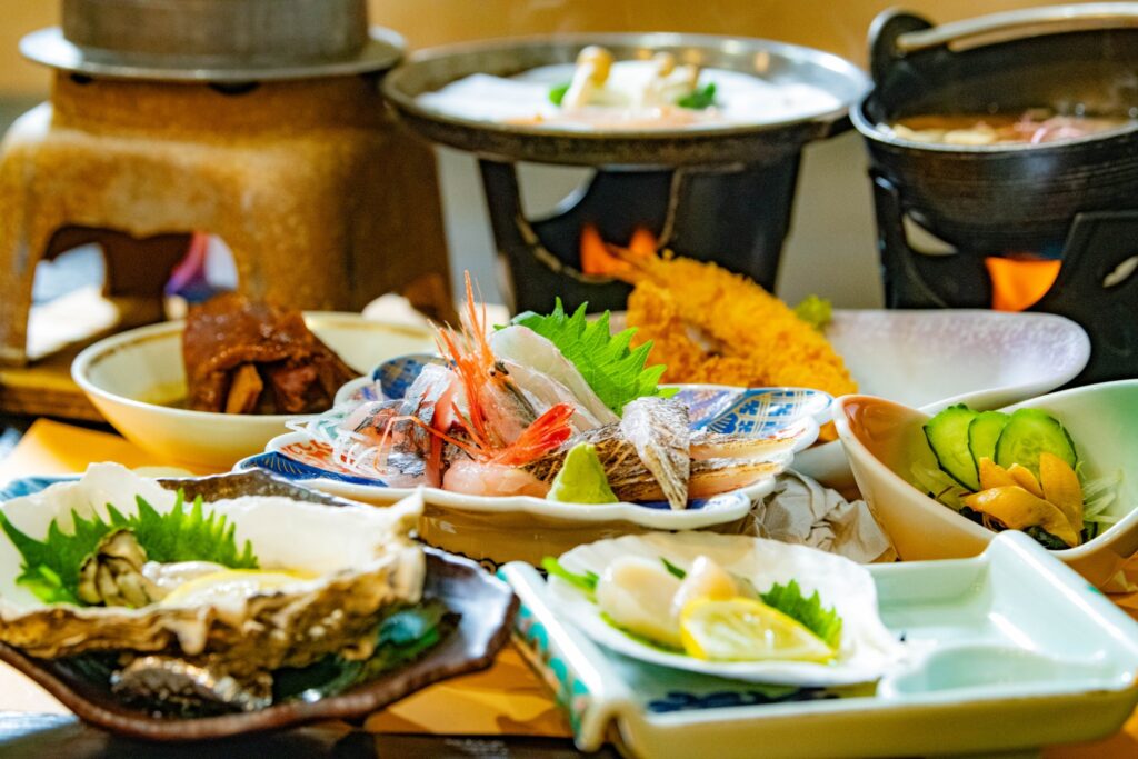 三陸産アワビや仙台黒毛和牛が味わえるプランがあり、豪華なお料理が味わえる宿泊施設です。毎日、南三陸・気仙沼から新鮮な魚介類を買い付けて、その時に一番鮮度のいい海産物をご提供しています。また、豪勢な刺身盛りなどもご提供できますので、お祝い事などにもご利用いただいています。