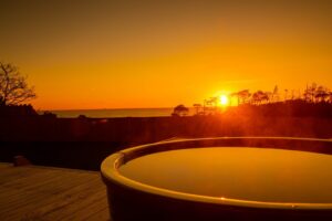 本館とは別に建てられた南三陸町産木材を贅沢に使用した離れ宿「蒼天」。1日1組限定で海を独り占めできるプライベート空間。客室露天風呂、絵画のように外の景色を楽しめる内風呂、サウナなど日頃の疲れがほぐれていく癒しの時間を過ごすことができます。