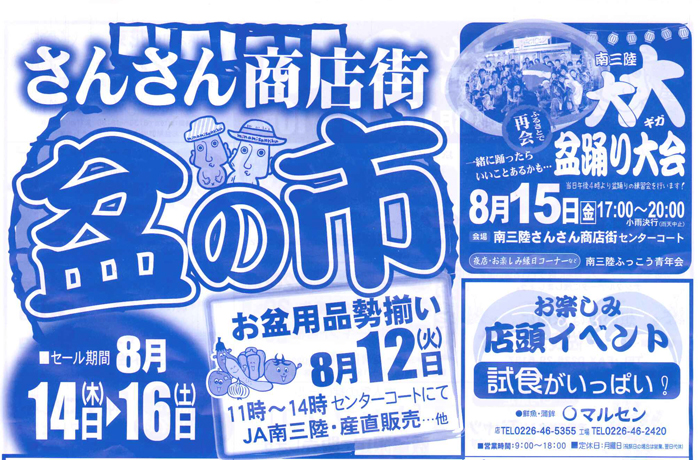 8月14日(木)~8月16日(土)の期間、@さんさん商店街にて「盆の市」セールが開催... -