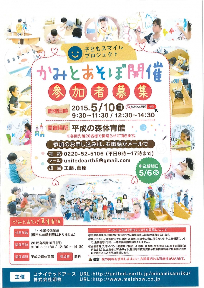 5月10日、平成の森体育館にて子どもスマイルプロジェクト「かみとあそぼ」が開... -