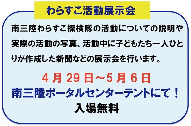2015年4月29日より5月6日まで、 南三陸わらすこ探検隊の活動展示会を、 南三陸ポー... -