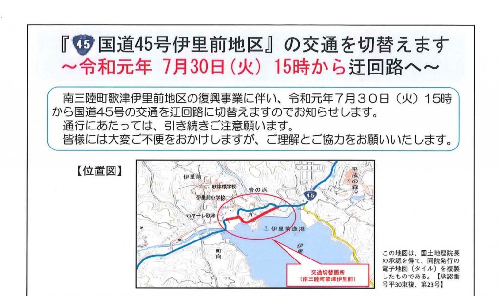 7/30(火)~ 国道45号伊里前地区の交通切替のお知らせ