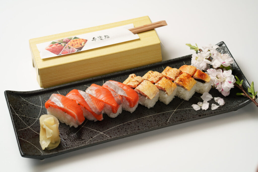 南三陸サーモンの酢〆とハラス焼の2種類の押し寿司。テイクアウトでも弁慶鮨自慢の鮨をご堪能ください。(テイクアウトのみ)