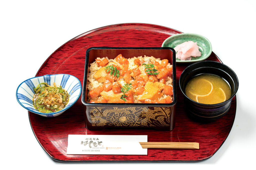 南三陸サーモンで出汁をとった炊き込みご飯に、漬けサーモンを散らして南三陸サーモンを余すことなく楽しんでいただけるように仕上げました。優しい味ながら、南三陸サーモンのうまみが凝縮されている一品です。 ※限定10食