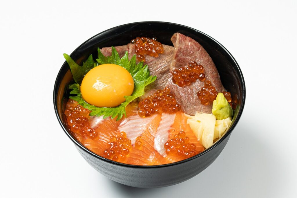 脂ののったサーモンと極上肉をひとつの丼に合わせました。