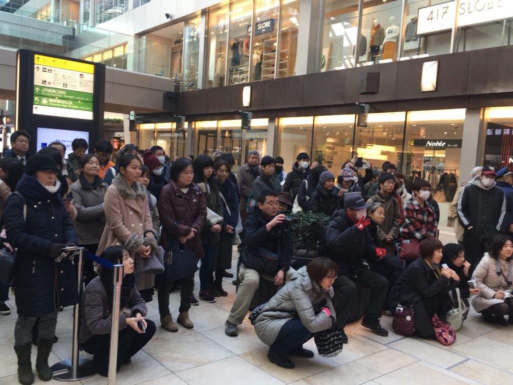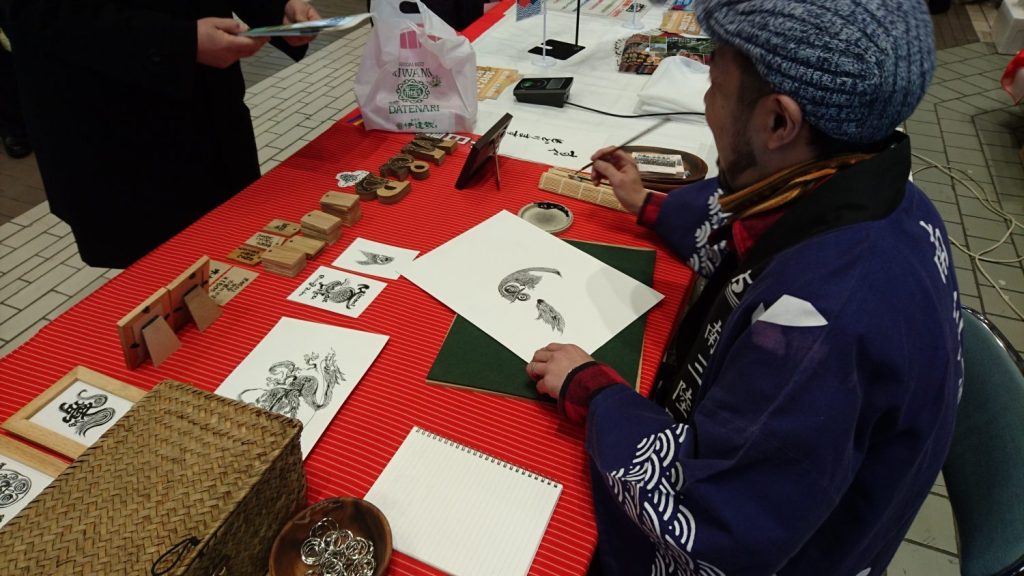 それは、仙台駅その場で筆を使いお客様の目の前で絵を描き魅了させていました。特に駅に立ち寄る外人の方々は興味津々に小山さんの描く姿をご覧になっていました。ご覧になった全てのお客様にとってとてもいい経験だったのかもしれません。