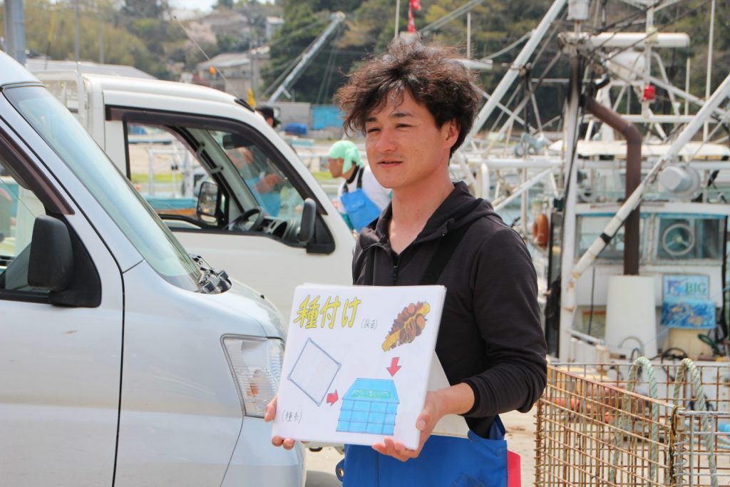 乗船前に、金比羅丸船頭・高橋直哉さんから紙芝居を用いたワカメの説明が