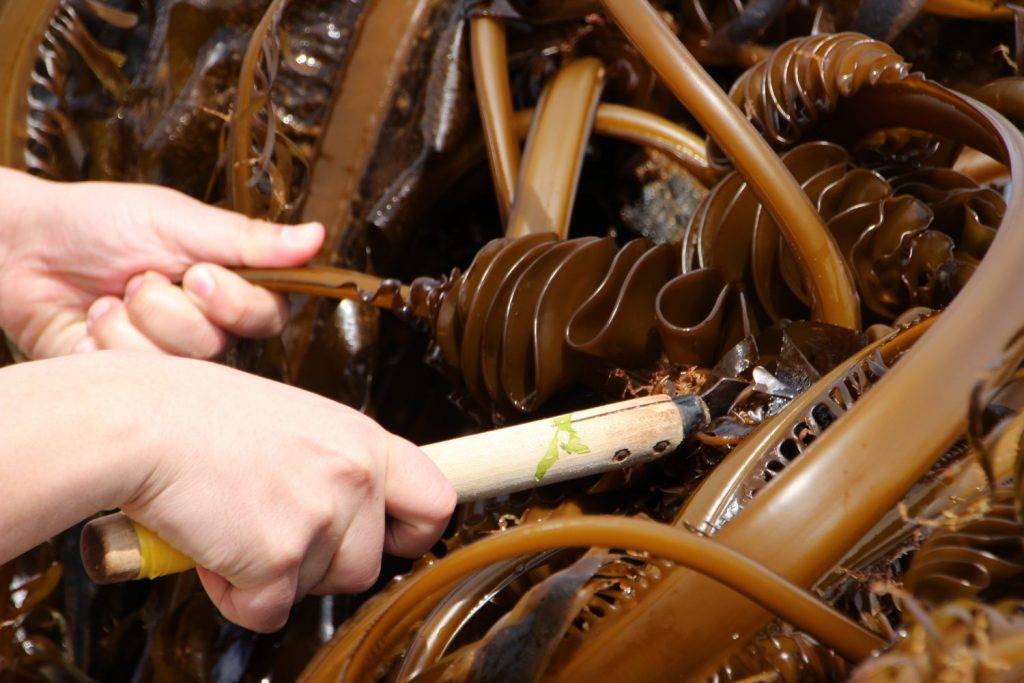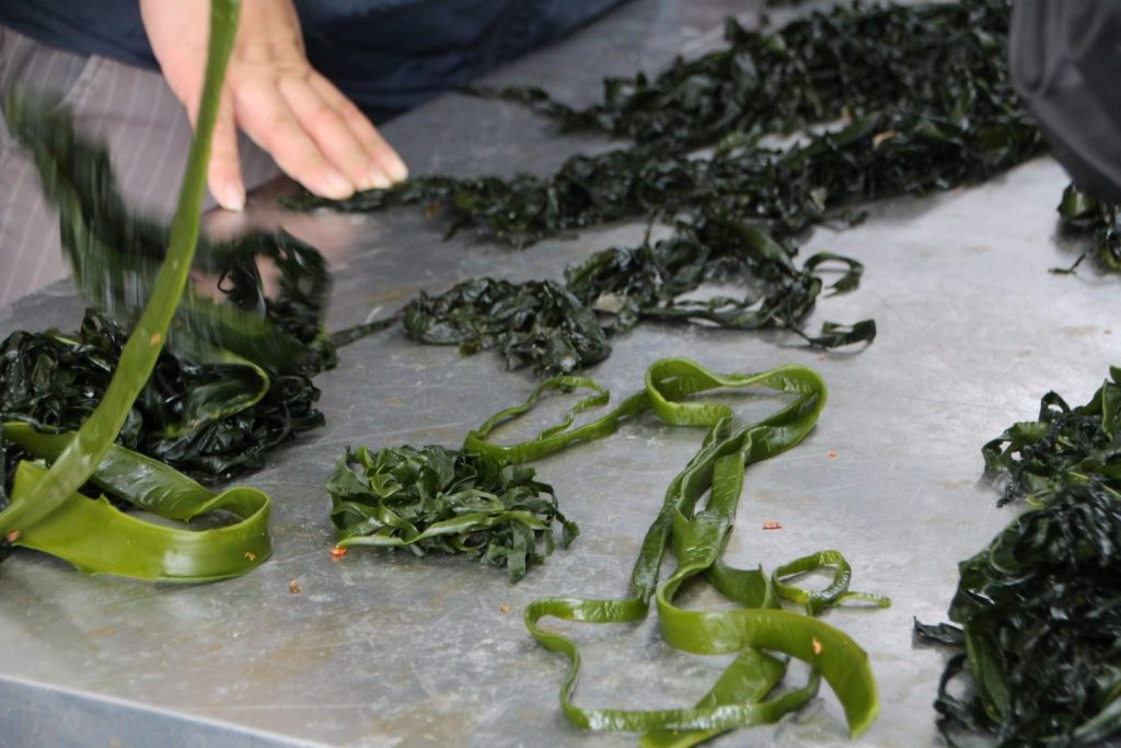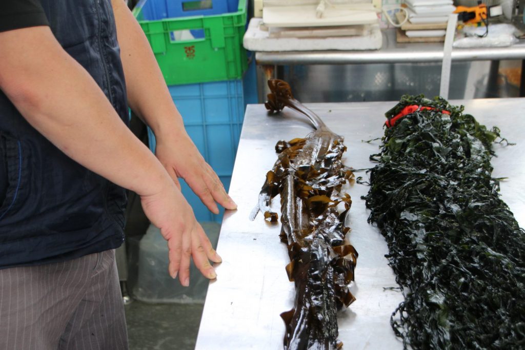 陸地に戻ってからは、メカブ削ぎとワカメの選別作業を体験します。