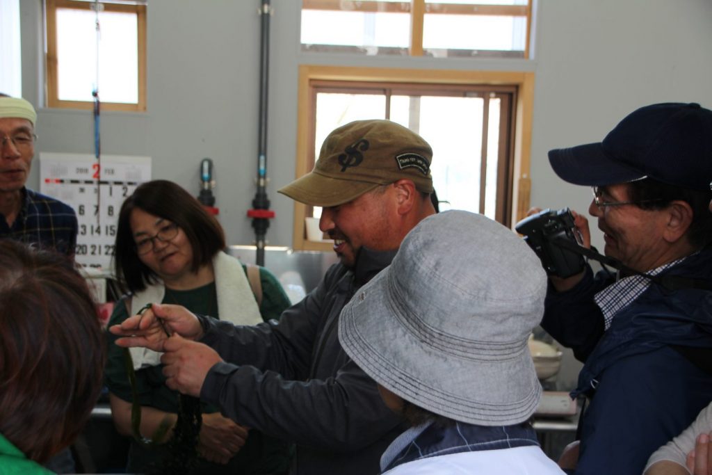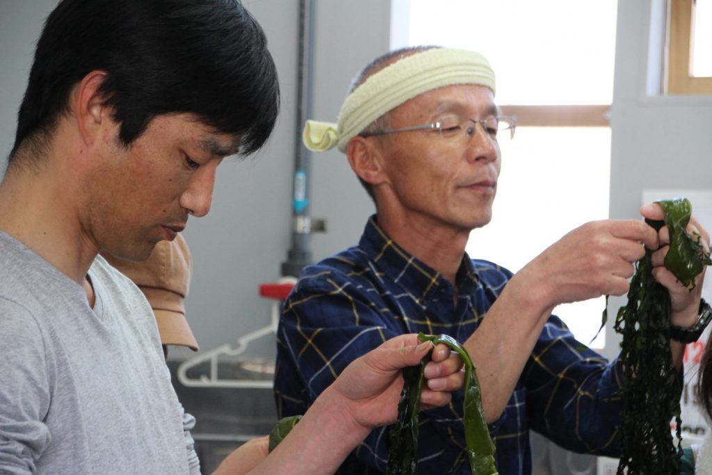 作業場へ移動し、ワカメの芯抜き体験が始まりました。