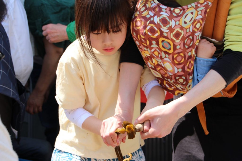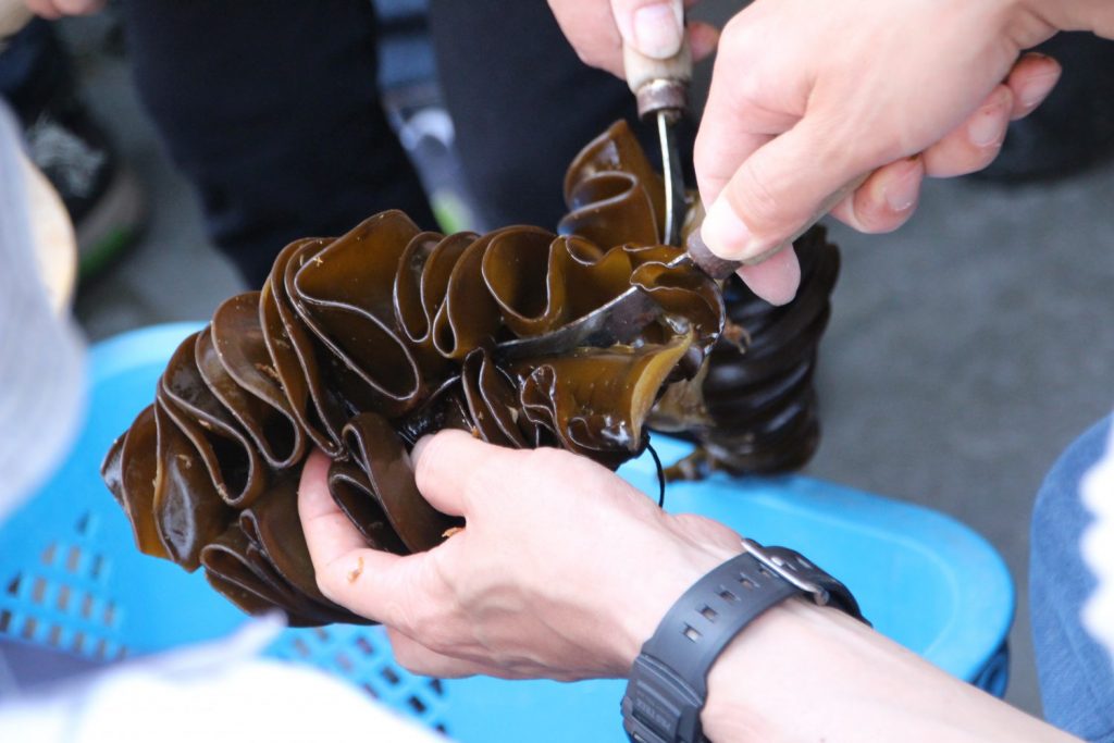 専用の“めかぶカッター”を使い、「これは気持ちいい!」と皆様大喜びです。