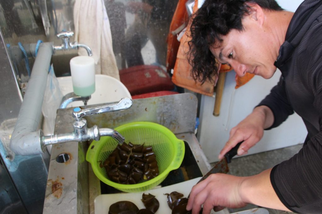 まずはめかぶを綺麗に洗浄し、漁師がマグロを捌くようにカットしていきます。
