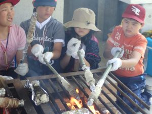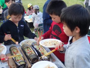 自分たちで調理をし火を点け、できた料理は「タケノコごはん」「銀鮭の竹筒蒸し焼き」「春野菜の味噌汁」(超豪華!)の3点が完成。みんなおいしくできたかな?