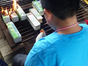牛乳パックを利用して作る簡単ホットサンドイッチです。ひとり1本マッチを渡され、自分で火をつけました。マッチが怖い子もいましたが、みんな点火することができましたよ。